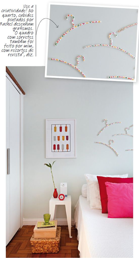 9- Não precisa de muito dinheiro pra decorar a parede. Basta um pouquinho de criatividade e colocar a mão na massa. Fica aí uma ideia para você que está com as paredes vazias: pinte uns cabides!