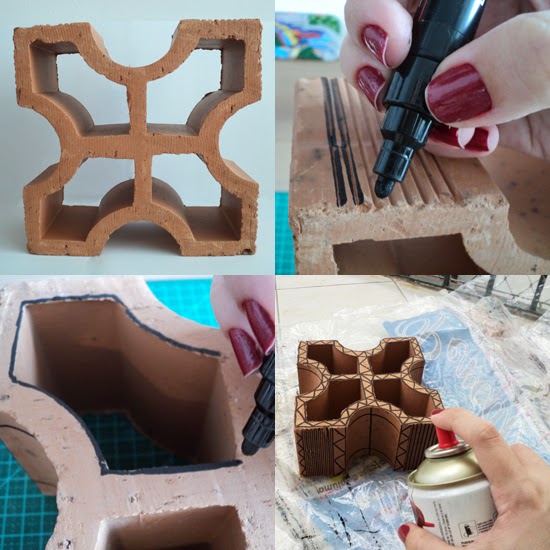 2/3 – Faça os desenhos como bem desejar. Mas aviso: não adianta dar uma de perfeccionista, o tijolo tem a superfície irregular em algumas partes, pequenos pedaços quebrados. Ou seja, por mais que você queira, tem horas que o desenho não terá como ficar perfeito. Abstraia.