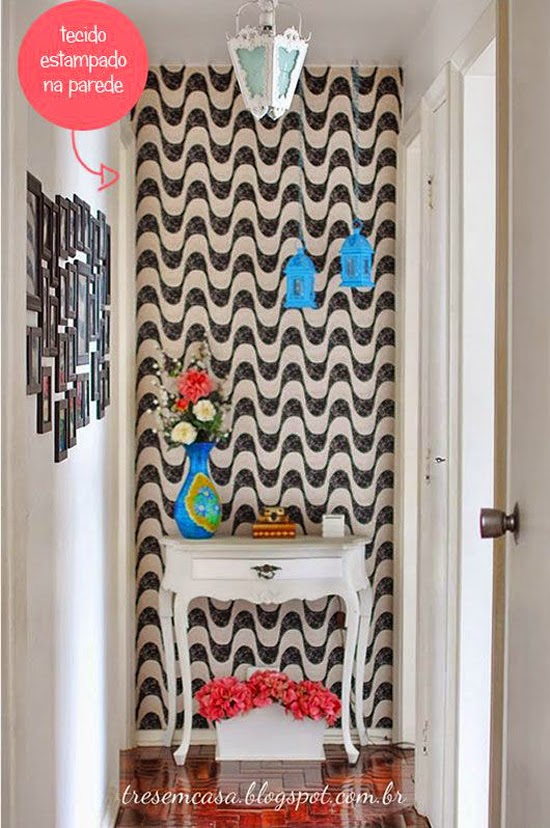 Como vocês podem ver, meu corredor é MUITO pequeno, por isso fui criticada por uma pessoa: “mas você colocou um tecido escuro aí, não se pode colocar cor escura num ambiente pequeno”. GENTE! Ninguém é obrigado a gostar da minha parede, gosto é gosto e cada um tem o seu. Mas o que eu acho válido lembrar é que na decoração não deve existir regras rígidas, apenas dicas. Segundo, de fato há esse conceito de que cores claras ampliam o ambiente, mas nem sempre temos a necessidade de ampliá-lo só porque ele é pequeno. Assumi meu corredor do tamanho que ele é, e resolvi destacá-lo.