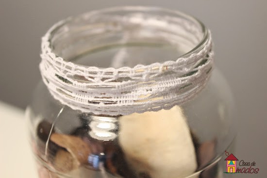 Para fazer, não tem mistério algum. Basta um vidro de produto em conserva, despejar o produto lá dentro e uma rendinha para disfarçar a rosca da tampa. O custo? Em euros, 1,50 – que foi o preço do pacote das cascas/pétalas. E só, o resto foi reaproveitamento.