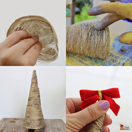 Passo 3: Com a ajuda do pincel, espalhe cola branca pelo cone e comece a enrolar o sisal. Quanto mais você enrolar, mais durinho a árvore-cone fica, isso fica a seu critério. Quando acabar de enrolar, passe um pouco mais de cola por cima.