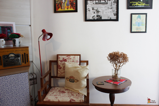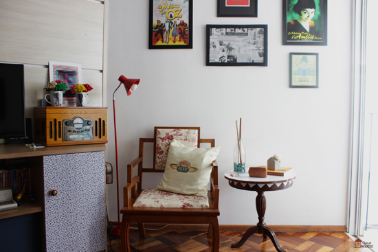 Quando eu saí de casa, comprei pouquíssimos móveis. A grande maioria, eu tive a sorte de receber doações de amigos e familiares. Uma das doações, foi essa mesinha lateral, que ganhei de um casal de amigos. Caiu como uma luva porque eu precisava de um apoio no cantinho de leitura – sou dessas que carrega comida e bebida pela casa. Mas eu sempre achei que a madeira escura pesava um pouco esse cantinho porque o taco do piso já é bem escuro e sempre tive vontade de dar uma quebrada nela. Lá em 2012/ 2013, a minha primeira ideia foi pintar. Mas não sei porque, não tive coragem de pintar essa mesa. Provavelmente porque, em alguma decoração futura, talvez eu fique feliz com ela na cor original.