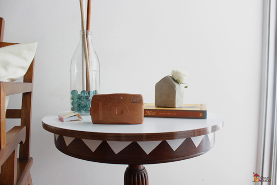 Já que a mesinha estava de carinha nova, aproveitei para mudar as coisas de lugar: o livro da Alice no País das Maravilhas saiu da prateleira e ganhou destaque com a casinha de cimento que ganhei da Carla, do The Blue Post.