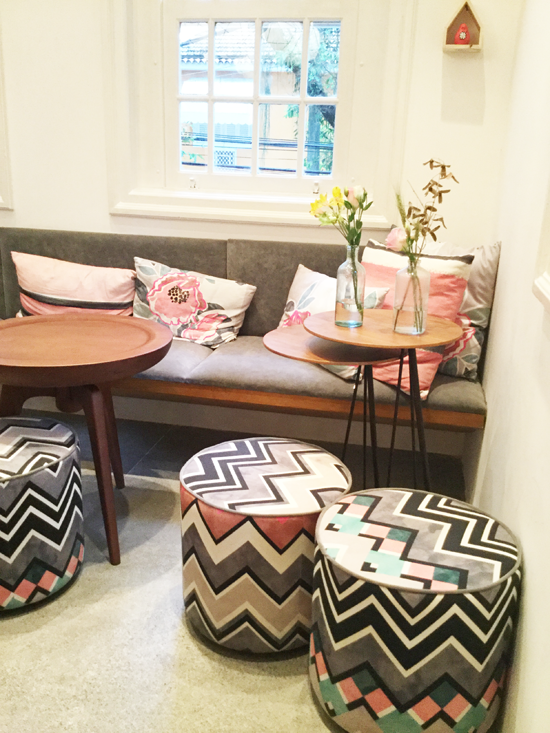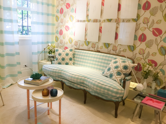 E gostei muito do que vi nesse ambiente – adorei o revestimento da parede e o teto florido com fundo cinza me encantou! Curti bastante também o sofazinho, as mesinhas e os puffs.