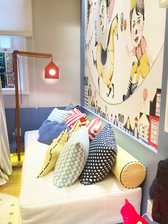 Gostei muito da meia parede azul, do painel lúdico, das estampas divertidas das almofadas, da luminária de casinha. Nada aqui é tão óbvio!